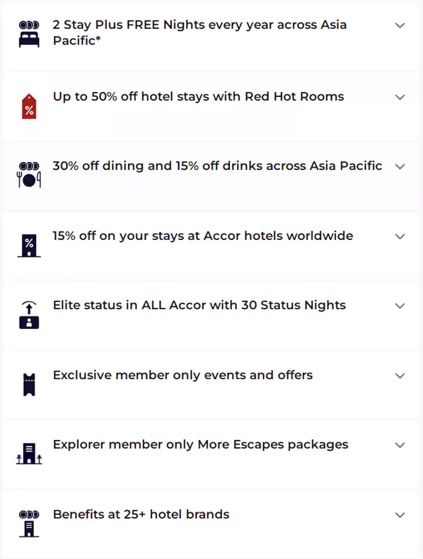 | 雅高A佳 Accor Plus | Explorer | AUD399 (RMB1840) | 亞太區(中國大陸僅部分權益) | 20個定級房晚 | Stay+券x1(第二晚免費) 訂房折扣 餐飲折扣 |
